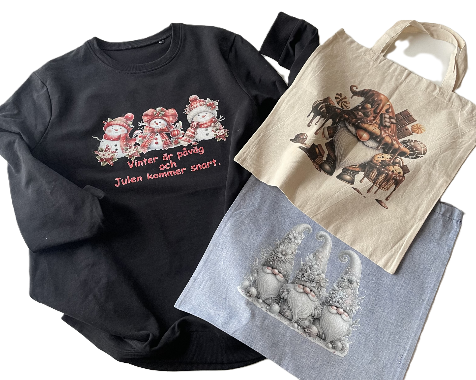 Vi kan också göra tröjor med julmotiv, kassar.